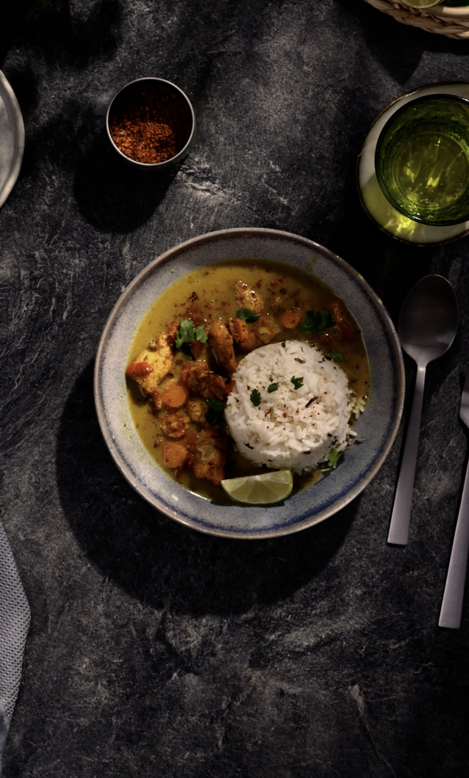 Hol dir Urlaubsfeeling mit unserem Grünen Thai Curry nach Hause! Mit zarten Hähnchenbrustfilets, raffinierten Zutaten und Kokosnussmilch bietet unser Grünes Thai Curry mit Basmatireis & Wildreis eine erfrischende und exotische Pause.